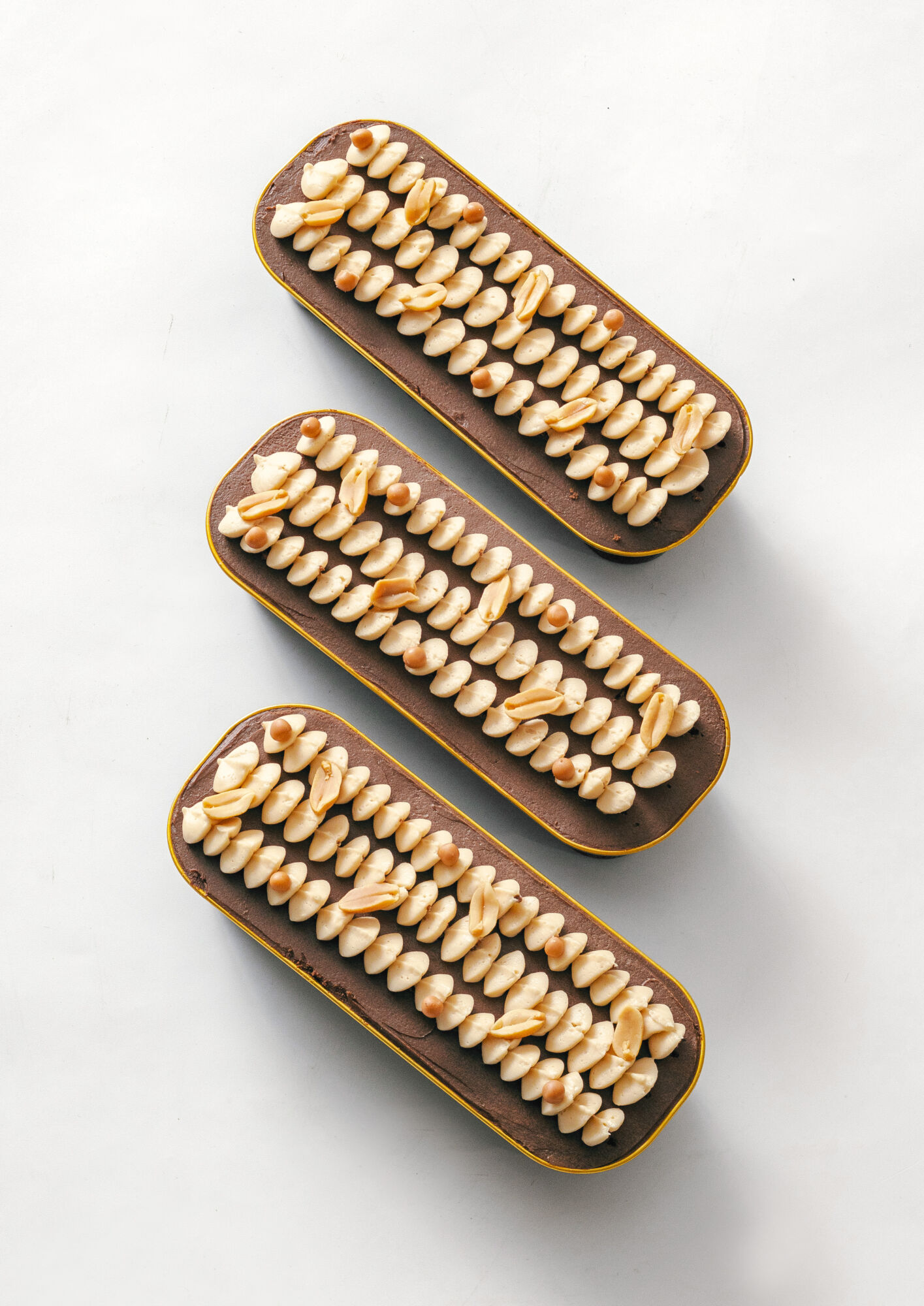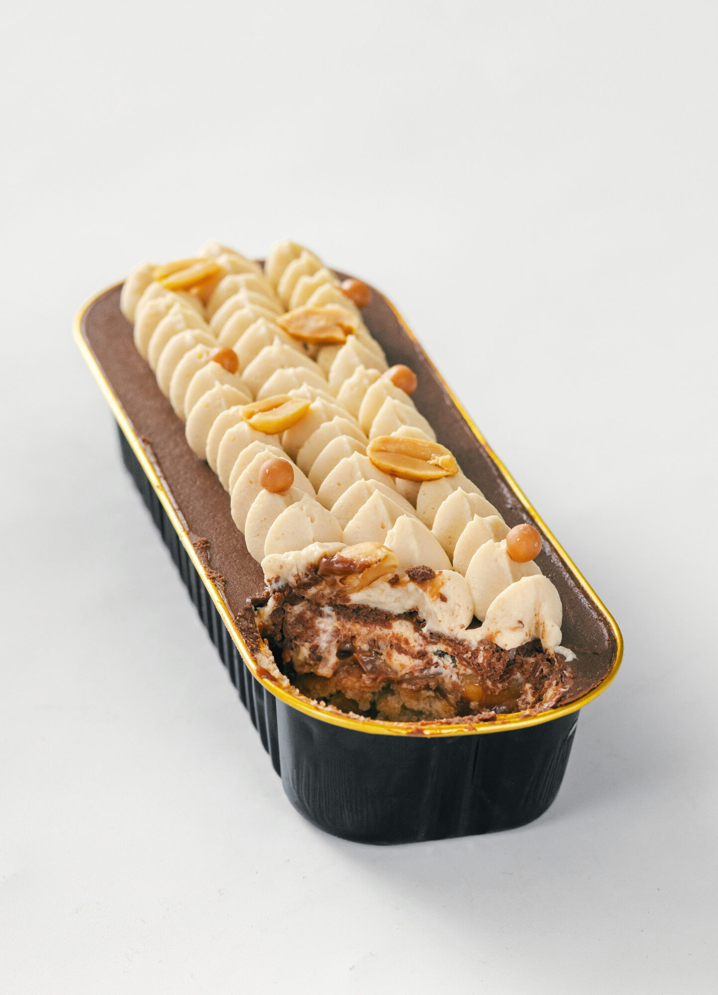 Další vrstvu tvoří sametová ganache z hořké čokolády a másla. Hluboká, intenzivní a přesně ta, která propojí sladkost karamelu s arašídy do jednoho dechberoucího sousta.