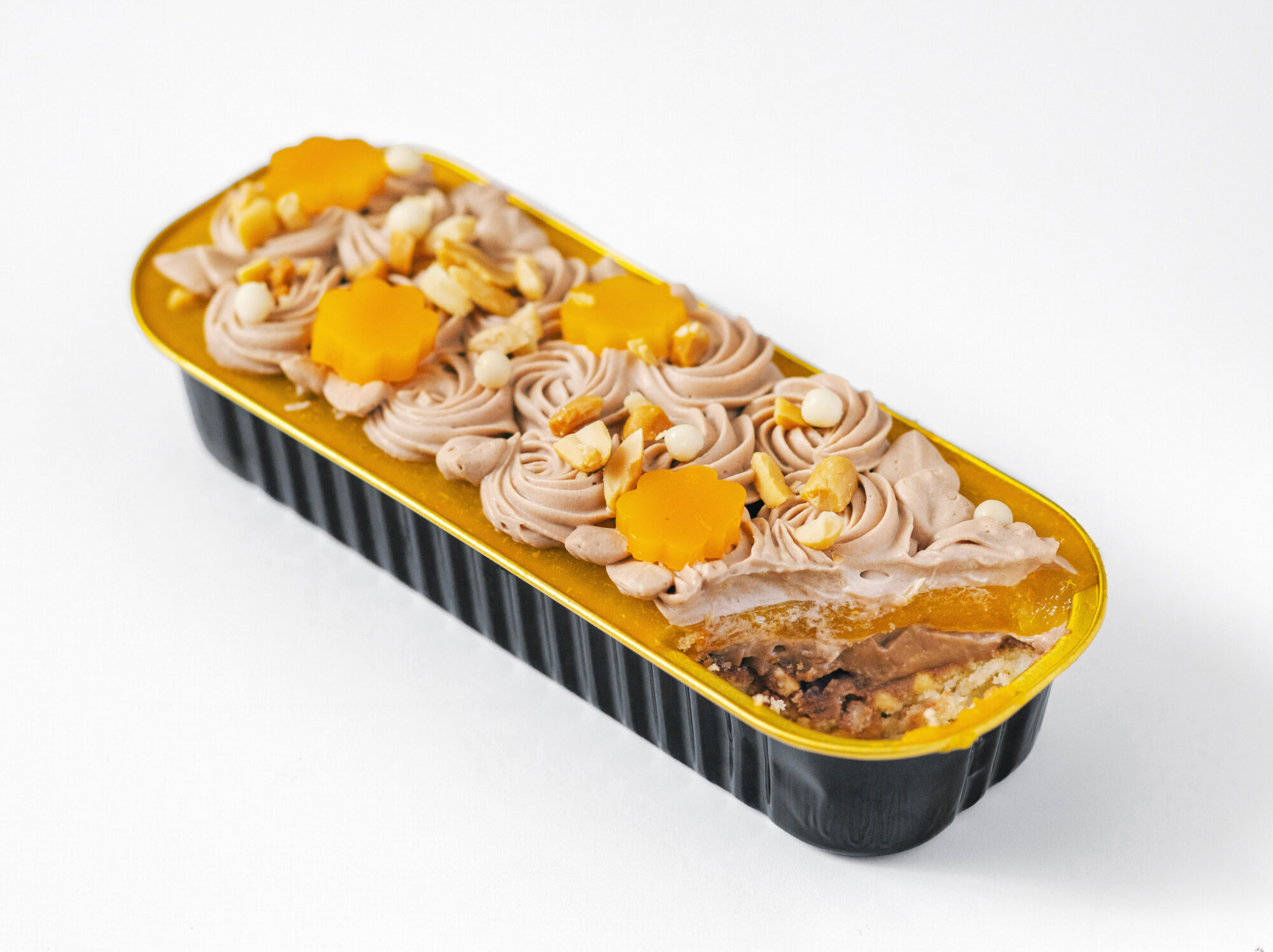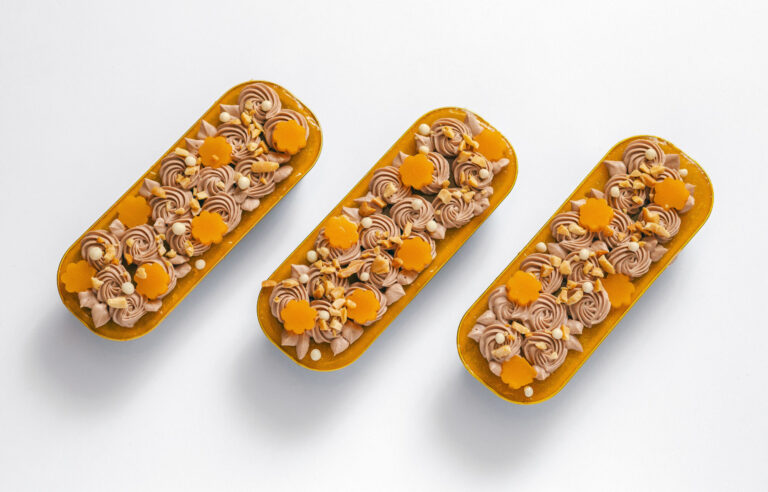Petit Cake Arašídy – Mandarinky – Mléčná čokoláda je dezert plný kontrastů: sladký, slaný, svěží i krémový.